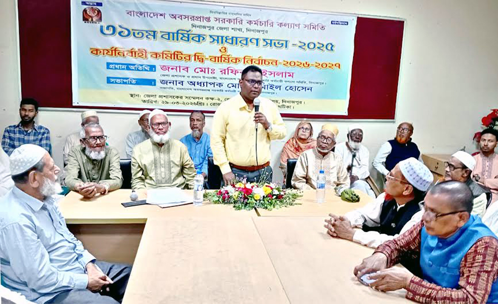 আজ রোববার জেলা প্রশাসক সম্মেলন কক্ষ-২ এ বাংলাদেশ অবসরপ্রাপ্ত সরকারি কর্মচারী কল্যাণ সমিতির ৩১তম বার্ষিক সাধারন সভার উদ্বোধনীপর্বে তিনি প্রধান অতিথির বক্তব্যে একথা বলেন। বাংলাদেশ অবসরপ্রাপ্ত সরকারি কর্মচারী কল্যাণ সমিতির সভাপতি অধ্যাপক মো. ইসমাইল হোসেন এর সভাপতিত্বে বার্ষিক প্রতিবেদন ও কোষাধ্যক্ষের প্রতিবেদন পাঠ করেন কোষাধ্যক্ষ মো. ফসিউদ্দিন আহমেদ। প্রতিবেদনের উপর আলোচনা করেন সাধারন সদস্য গোবিন্দ ভট্টাচার্য, মো. আকবর আলী, আবুল কালাম আজাদ প্রমুখ। শেষে উপস্থিত সদস্যরা হাত তুলে কন্ঠ ভোটের মাধ্যমে প্রতিবেদন দুটির অনুমোদন প্রদান করে। দ্বিতীয় পর্বে প্রধান নির্বাচন কমিশনার ডাঃ মো. সাহাবুদ্দিন আহমেদ, সহকারী কমিশনার মো. খায়রুল ইসলাম ও মশিহুর রহমান বিনা প্রতিদ্বন্দ্বীতায় নির্বাচিত কার্যনির্বাহী কমিটির সভাপতি মো. মোকাররম হোসেন, সাধারন সম্পাদক মো. ফসিউদ্দিন আহমেদসহ ১৭ সদস্য বিশিষ্ট ২ বছর মেয়াদী কমিটির নাম ঘোষনা করেন। সভার শুরুতে সমিতির সদস্য যারা ইতিপূর্বে ইন্তেকাল করেছেন তাদের রুহের মাগফেরাত কামনা করে দোয়া পরিচালনা করেন মাওলানা গোলাম রসুল। সার্বিক তত্ত্বাবধানে ছিলেন অফিস সহকারী ও কম্পিউটার অপারেটর মো. হাসনাত রহমান।