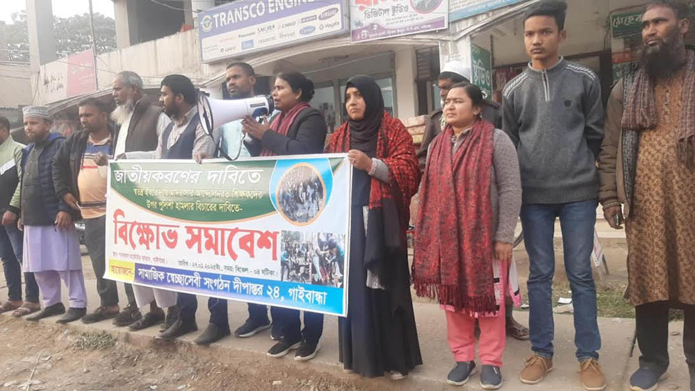 সংগঠনের সভাপতি এ এস এম মনিরুজ্জামান সবুজের সভাপতিত্বে বক্তব্য দেন স্বতন্ত্র এবতেদায়ী মাদ্রাসার শিক্ষক হাবিবুল্যাহ নুরী, নুরুল হক নুর, সংহতি জানিয়ে বক্তব্য দেন সমাজতান্ত্রিক ছাত্রফ্রন্ট জেলা সভাপতি পরমানন্দ দাস, রাহেলা সিদ্দিকা, বাংলাদেশ নারীমুক্তি কেন্দ্রের কেন্দ্রীয় সাধারণ সমপাদক অ্যাড. নিলুফার ইয়াসমিন শিল্পী প্রমুখ।