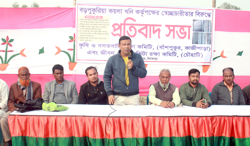 কৃষি ও বসতবাড়ি রক্ষা কমিটি এবং জীবন ও বসতভিটা রক্ষা কমিটির উদ্যোগে দিনাজপুরের বড়পুকুরিয়া খনি এলাকায় ক্ষতিগ্রস্তদের ক্ষতি পূরণের দাবিসহ কর্তৃপক্ষের স্বেচ্ছাচারীতার বিরুদ্ধে প্রতিবাদ সভা করেছে গ্রামবাসীরা।