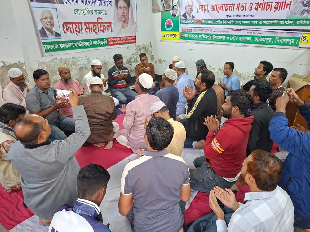 বিএনপি চেয়ারপারসন ও সাবেক প্রধানমন্ত্রী দেশনেত্রী বেগম খালেদা জিয়ার আশু রোগমুক্তি ও সুস্থতা কামনায় দিনাজপুরের হাকিমপুর হিলি পৌর বিএনপি’র উদ্যোগে এক বিশেষ দোয়া মাহফিলের আয়োজন করা হয়।