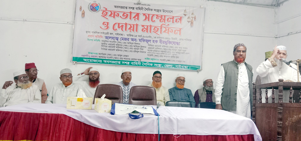 অবসরপ্রাপ্ত সশস্ত্র বাহিনী সৈনিক সংস্থা গাইবান্ধা জেলা শাখার উদ্যোগে আজ শনিবার স্থানীয় পাবলিক লাইব্রেরী মিলনায়তনে ইফতার সম্মেলন ও দোয়া মাহফিল অনুষ্ঠিত হয়। এতে প্রধান অতিথি ছিলেন অবসরপ্রাপ্ত মেজর বীর মুক্তিযোদ্ধা মফিজুল হক।