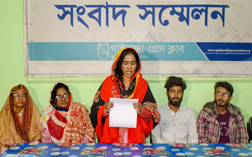 গাইবান্ধা শহরের দক্ষিণ বানিয়ারজান এলাকার লাকী বেগম নামের ওই গৃহবধূ সংবাদ সম্মেলনে জানান, পুত্রবধূ ফাতেমাতুজ জোহরার অপহরণ মামলায় ছেলে ফয়সাল লেলিন জেলে রয়েছেন। গতকাল রোববার তিনি ছেলের জামিনের জন্য গাইবান্ধা কোর্টে যান। জামিন না হলে কোর্ট থেকে ফেরার পথে মূল গেটের কাছে এলে ছেলের শ্বশুর আশরাফুল আলম বাদশা এবং সুজন মিয়ার নেতৃত্বে একটি সন্ত্রাসী দল তার ও সঙ্গীদের ওপর অতর্কিত হামলা চালায়। একপর্যায়ে তার শ্লীলতাহানি ঘটিয়ে ভ্যানিটি ব্যাগ থেকে নগদ টাকা, ২টি মোবাইল ফোন ও স্বর্ণের চেইন ছিনিয়ে নেয়। তাকে বাঁচাতে এগিয়ে এলে বড় বোন রিতা বেগম ও নাতি শাকিল শেখকেও মারপিট করা হয়। এ ঘটনায় সদর থানায় একটি এজাহার দায়ের করা হয়েছে। কিন্তু এজাহারটি মামলা হিসেবে অন্তর্ভুক্ত করা হয়নি। ফলে অভিযুক্ত আসামিদের উপর্যুপরি হুমকিতে চরম নিরাপত্তাহীনতায় ভুগছে গৃহবধূর পরিবার। এ বিষয়ে থানায় মামলা গ্রহণসহ নিরাপত্তা নিশ্চিতের জন্য প্রশাসনের প্রতি অনুরোধ জানিয়েছেন গৃহবধূ।