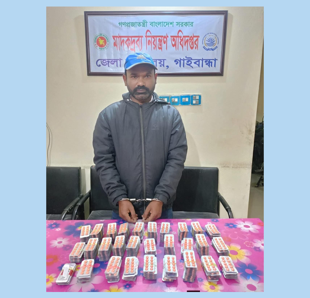 গাইবান্ধার গোবিন্দগঞ্জ উপজেলায় মাদকবিরোধী অভিযানে বিপুল পরিমাণ ট্যাপেন্টাডল ট্যাবলেটসহ এক ব্যক্তিকে গ্রেফতার করেছে  গাইবান্ধা জেলা মাদকদ্রব্য নিয়ন্ত্রণ অধিদপ্তর।