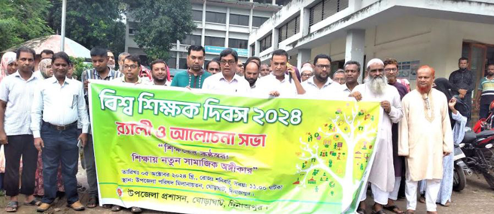 দিনাজপুরের ঘোড়াঘাটে উপজেলা প্রশাসনের আয়োজনে র‌্যালী আলোচনা সভার মধ্য দিয়ে বিশ্ব শিক্ষক দিবস পালিত হয়েছে। এবারের প্রতিপাদ্য বিষয় ছিল, “শিক্ষকের কণ্ঠস্বর, শিক্ষায় নতুন সামাজিক অঙ্গীকার”। দিবসটি উপলক্ষে আজ শনিবার উপজেলা পরিষদ থেকে বিভিন্ন স্কুল, কলেজ, মাদ্রাসার শিক্ষক-শিক্ষার্থীদের নিয়ে এক র‌্যালী বের করা হয়। র‌্যালীটি ওসমানপুর বাজারের প্রধান প্রধান সড়ক প্রদক্ষিণ শেষে ওসমানপুর বালিকা উচ্চ বিদ্যালয়ে এসে শেষ হয়। পরে সেখানে সেমিনার কক্ষে আলোচনা সভা অনুষ্ঠিত হয়। এতে ঘোড়াঘাট সরকারী কলেজের অধ্যক্ষ এস,এম মনিরুল ইসলামের সভাপতিত্বে ও একাডেমিক সুপার ভাইজার ধ্বীরাজ সরকারের সঞ্চালনায় প্রধান অতিথি হিসেবে বক্তব্য রাখেন, সহকারী কমিশনার (ভূমি) আব্দুল আল মামুন কাওছার শেখ। বিশেষ অতিথির বক্তব্য রাখেন, পৌর বিএনপির সভাপতি ও সাবেক মেয়র আব্দুস ছাত্তার মিলন, সহকারী শিক্ষা অফিসার আব্দুল ওয়াকিল, ঘোড়াঘাট মহিলা কলেজের অধ্যক্ষ মঞ্জুরুল ইসলাম, উপজেলা মাধ্যমিক শিক্ষক সমিতির সভাপতি লুৎফর রহমান সরকার, ছয়ঘট্টি দাখিল মাদ্রাসার সুপার আলতাফ হোসেন, নুরজাহানপুর অবঃ সামরিক কলোনী উচ্চ বিদ্যালয়ের প্রধান শিক্ষক কমল কণ্ঠ, সহকারী শিক্ষক আনিছুর রহমান, মাসুদা বেগম, মনোরঞ্জন মহন্ত প্রমুখ।