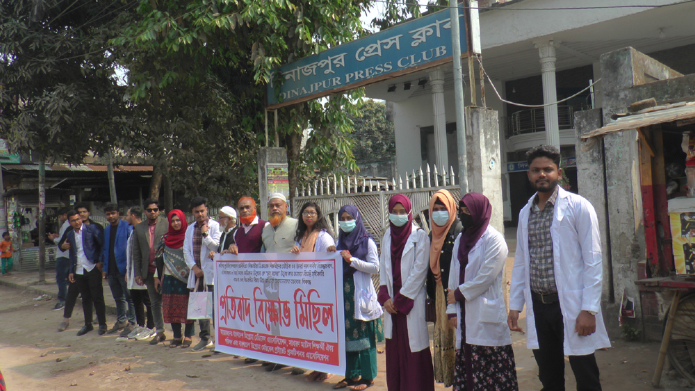 আজ সোমবার বেলা ১১টায় দিনাজপুর প্রেসক্লাবের সামনের সড়কে মানববন্ধন চলাকালে বক্তারা বলেন, কতিপয় প্রতিহিংসাপরায়ণ এমবিবিএস শিক্ষার্থী বিডিএমএফ ও ম্যাটস ঐক্য পরিষদের যৌক্তিক ৪ দফার বিরোধিতা করছে। ৪ বছর ৬ মাসের ডিপ্লোমা কোর্সকে তারা ৬ মাস উল্লেখ করে জনমনে বিভ্রান্তি ছড়াচ্ছেন। আমরা এর তীব্র প্রতিবাদ করছি।