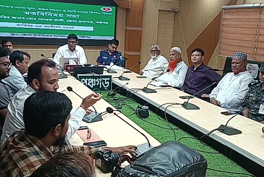 এবার সেই প্রতিবেদনের আলোকে বেশ কিছু সিদ্ধান্ত নিয়েছে জেলা প্রশাসন। প্রতিবেদনের আলোকে গৃহিত সিদ্ধান্তসমূহ অবহিত করার জন্য আজ বুধবার দুপুরে জেলা প্রশাসনের আয়োজনে সম্মেলন কক্ষে এক মতবিনিময় অনুষ্ঠিত হয় । এতে জেলা প্রশাসক মো. সাবেত আলীর সভাপতিত্বে অতিরিক্ত জেলা প্রশাসক (সার্বিক) আবু সাইদ, অতিরিক্ত পুলিশ সুপার কনক কুমার দাস, চা বোর্ডের উন্নয়ন কর্মকর্তা আমির হোসেন, জেলা বিএনপির আহ্বায়ক জাহিরুল ইসলাম কাচ্চু, সাবেক পৌর মেয়র ও পৌর বিএনপির আহ্বায়ক তৌহিদুল ইসলাম, পঞ্চগড় প্রেস ক্লাবের আহ্বায়ক সরকার হায়দার সহ বায়ার, বিডার, কারখানা মালিক সহ সংশ্লিস্টরা উপস্থিত ছিলেন। সভায় জেলা প্রশাসক বলেন, বেশ কিছু দিন থেকে মাঠ থেকে সংকটের কারণ উদঘাটনের জন্য একটি টিমের মাধ্যমে তথ্য সংগ্রহ করে কিছু সিদ্ধান্ত গৃহিত হয়েছে। এর মাঝে ক্ষুদ্র চা চাষিদের দাবির প্রেক্ষিতে প্রতি কেজি কাঁচা চা পাতার মুল্য ১৭ টাকা করা হয়েছে। এছাড়াও চা কারখানাগুলো অবৈধভাবে চোরাই পথে চা বিক্রি করার কারণে ন্যায্য মূল্য থেকে বঞ্চিত হচ্ছেন অনেকে। এছাড়াও এ কারণে চায়ের বাজারে অস্থিতিশীল পরিবেশ বিরাজ করছে। এমন অবস্থায় আমরা সকলকে সতর্ক করতে চাই। আগামী বৃহস্পতিবার থেকে গৃহীত সিদ্ধান্তগুলো বাস্তবায়ন হবে। সিদ্ধান্ত বাস্তবায়নে একটি মনিটরিং টিম গঠন করা হয়েছে।