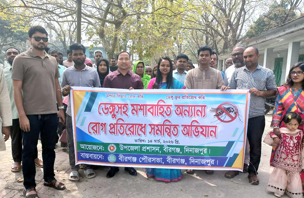 দিনাজপুরের বীরগঞ্জে ডেঙ্গুসহ মশাবাহিত বিভিন্ন রোগ প্রতিরোধে সমন্বিত পরিচ্ছন্নতা ও সচেতনতামূলক অভিযান অনুষ্ঠিত হয়েছে। “মশার বিস্তার রোধ করি, ডেঙ্গু জ্বর প্রতিরোধ করি” প্রতিপাদ্যকে সামনে রেখে আজ শনিবার সকালে উপজেলা পরিষদ চত্বরে এ কর্মসূচি পালন করা হয়।