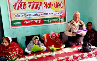 আজ শনিবার অনন্যা সংস্থার সভাপতি বিলকিস আরা বেগমের সভাপতিত্বে বার্ষিক প্রতিবেদন পাঠ করেন অনন্যা সংস্থার নির্বাহী পরিচালক (সদস্য সচিব) বিশিষ্ট ডায়াবেটিস চিকিৎসক ডা. চৌধুরী মোসাদ্দেকুল ইজদানী। আয়-ব্যয়ের প্রতিবেদন পাঠ করেন অনন্যা সংস্থার কোষাধ্যক্ষ মো. তাজুল ইসলাম। প্রতিদেন দুটির উপর আলোচনা করেন সহ-সভাপতি আক্তারা বেগম, সদস্য নাজমা মসির, দেলোয়ারা বেগম, সুফিয়া কামাল, এ.এস. রাহেলা জিন্নাত, মোমতাহিনুল চৌধুরী ইয়াজদানী, আসাদুজ্জামান আসাদ, সুবির কুমার সেন, মো. মহসিন হোসেন। আলোচনা সভা শেষে হাত তুলে কন্ঠ ভোটের মাধ্যমে প্রতিবেদন দুটির অনুমোদন প্রদান করেন উপস্থিত সদস্যবৃন্দ। গত সাধারন সভার কার্যবিবরণী পাঠ করেন নির্বাহী সদস্য সুবর্ণা মোস্তফা কামাল। সভার শুরুতে শরিফ ওসমান হাদি’র মৃত্যুতে জাতীয় শোক উপলক্ষে তার রুহের মাগফেরাত সহ সংস্থার প্রতিষ্ঠালগ্ন হতে যারা ইন্তেকাল করেছেন তাদের রুহের মাগফেরাত কামনা করে এবং যারা অসুস্থ্য রয়েছেন তাদের সুস্থ্যতা কামনা করে দোয়া পাঠ করেন মো. মঞ্জুরুল ইসলাম। নির্বাহী পরিচালক ডা. চৌধুরী মোসাদ্দেকুল ইজদানী তার বক্তব্যে বলেন, আমরা প্রতিবন্ধী উন্নয়ন কার্যক্রম, নারী ও শিশু নির্যাতন প্রতিরোধ কার্যক্রম, জাতীয় ও বিশেষ দিবস পালন, শিক্ষা কার্যক্রম, তামাক ও মাদকবিরোধী কার্যক্রম, শীতবস্ত্র বিতরণ, ছাগল ও হুইল চেয়ার বিতরণ কার্যক্রম, সেমাই চিনি বিতরণ, দল গঠন ও সঞ্চয় কার্যক্রম এবং আয় বৃদ্ধিমূলক কার্যক্রম পরিচালনা করে আসছি। সার্বিক তত্ত্বাবধানে ছিলেন হিসাব রক্ষক আক্তারা বানু।