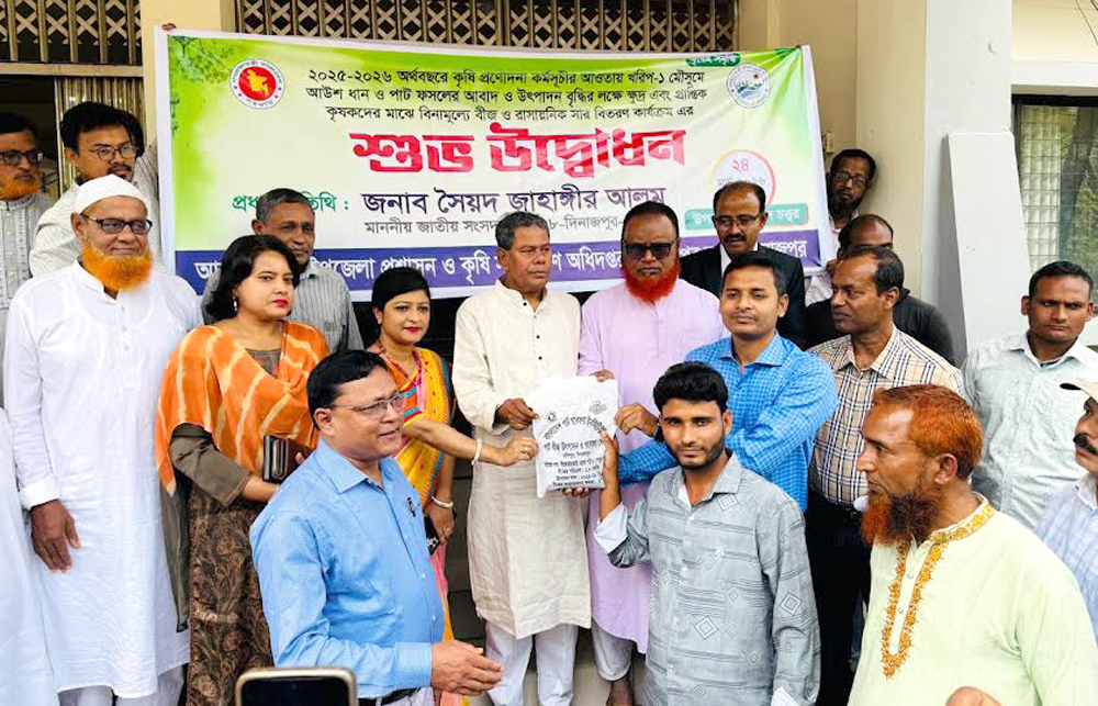 দিনাজপুর সদর উপজেলা প্রশাসন ও উপজেলা কৃষি সম্প্রসারণ অধিদপ্তরের আয়োজনে গতকাল মঙ্গলবার উপজেলা পরিষদ চত্বরে ২০২৫-২৬ অর্থবছরে কৃষি প্রনোদনা কর্মসূচির আওতায় খরিপ-১ মৌসুমে আউস ধান ও পাট ফসলের আবাদ ও উৎপাদন বৃদ্ধির লক্ষ্যে ক্ষুদ্র এবং প্রান্তিক কৃষকদের মাঝে বিনামূল্যে বীজ ও রাসায়নিক সার বিতরণ কার্যক্রমের উদ্বোধন করা হয়েছে।