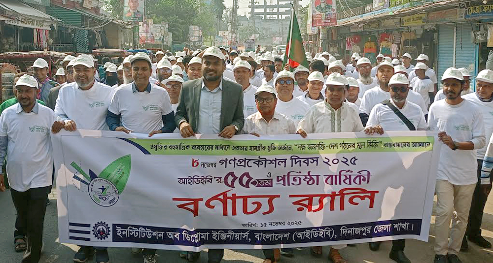 “প্রযুক্তির বহুমাত্রিক ব্যবহারের মাধ্যমে জনতার সামগ্রীক মুক্তি অর্জনে,”দক্ষতা জনশক্তি-দেশ গঠনের মূল ভিত্তি” বাস্তবায়নের আহবানে ইনস্টিটিউশন অব ডিপ্লোমা ইঞ্জিনিয়ার্স বাংলাদেশ (আইডিইবি) দিনাজপুর জেলা শাখার আয়োজনে আজ শনিবার গণ প্রকৌশল দিবস -২০২৫ ও আইডিইবির ৫৫তম প্রতিষ্ঠাবার্ষিকী উপলক্ষে আলোচনা সভা ও বর্ণাঢ্য র‍্যালি অনুষ্ঠিত হয়েছে।