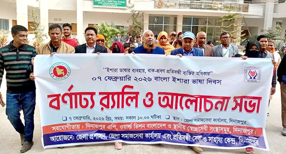 আজ শনিবার সকাল ১০ টায় জেলা সমাজ সেবা কার্যালয় হতে বর্ণাঢ্য র্যালী ও সমাজসেবা কার্যালয়ের মিলনায়তনে আলোচনা সভায় সভাপতিত্ব করেন জেলা সমাজ সেবা কার্যালয়ের সহকারী পরিচালক রকুনুজ্জামান মণ্ডল। স্বাগত বক্তব্য রাখেন জেলা প্রতিবন্ধী বিষয়ক কর্মকর্তা মো. মেহেদী হাসান। সম্মানিত অতিথি হিসেবে বক্তব্য রাখেন সমাজ সেবা কার্যালয়ের সহকারী পরিচালক মো. মনির হোসেন, শহর সমাজসেবা অফিসার মো. মাইনুল ইসলাম, রাজবাটি সরকারী শিশু পরিবারের উপতত্ববধায়ক মাহামুদা নুসরাত জাহান। শুভেচ্ছা বক্তব্য রাখতে গিয়ে দিনাজপুর এপি, ওয়ার্ল্ড ভিশন বাংলাদেশ এর স্পনসরশীপ ও চাইন্ড প্রোটেকশন অফিসার পেট্রিক রুরাম বলেন, ওয়ার্ল্ড ভিশন মূলত শিশুদের নিয়ে কাজ করে। ইতি মধ্যে আমরা প্রতিবন্ধী ও প্রতিবন্ধী শিক্ষার্থীদের মাঝে কম্বল বিতরণ করেছি। আমরা বিশ্বাস করি বৈষম্য নয়, সমতায় বাংলাদেশ গড়ে তোলা সম্ভব। উপজেলা সমাজসেবা অফিসার মো. গোলাম আজমের সঞ্চালনায় মুক্ত আলোচনা করেন সিডিডির প্রকল্প অফিসার শৈলেন চন্দ্র রায়, দিনাজপুর বধির ইনিস্টিটিউটের প্রধান শিক্ষক নাজনিন আক্তার, সিডিএর রির্সোস পার্সন অনামিকা পাণ্ডে, প্রতিবন্দী ও অটিস্টিক বিদ্যালয়ের প্রধান শিক্ষক আবু শাহ নেওয়াজ ও অভিভাবক সিমা বেগম। বক্তারা বলেন ইশারা ভাষা ব্যবহারকারীদের ভাষাগত এবং সাংস্কৃতিক পরিচয় নিশ্চিত করা রাষ্ট্রের অন্যতম দায়িত্ব। ইশারা ভাষা কোনো দূর্বলতা নয়, বরং এটি একটি শৈল্পিক এবং সমৃদ্ধ মাধ্যম। ইশারা ভাষা ছাড়া বাক-শ্রবন প্রতিবন্ধী ব্যাক্তিদের মানবাধিকার রক্ষা করা অসম্ভব। সমস্ত অনুষ্ঠানটি ইশারা ভাষার মাধ্যমে তুলে ধরেন রাবেয়া বেগম।