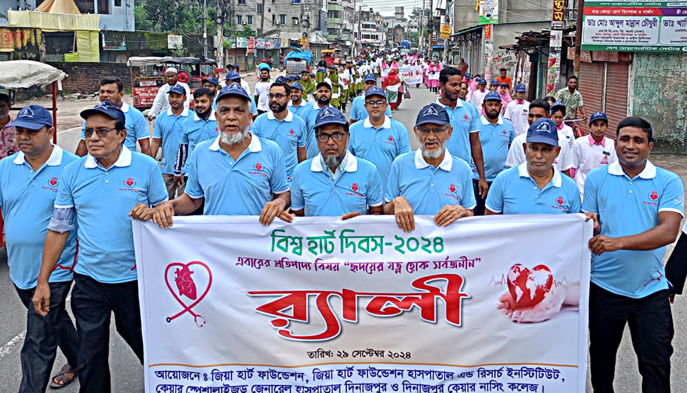 রোববার সকাল সাড়ে ৮টায় জিয়া হার্ট ফাউন্ডেশন হতে বিশ্ব হার্ট উপলক্ষে বর্ণাঢ্য র্যালী বের হয়ে শহরের প্রধান প্রধান সড়ক প্রদক্ষিণ শেষে আলোচনা সভায় গিয়ে মিলিত হয়। র্যালীতে নেতৃত্ব দেন জিয়া হার্ট ফাউন্ডেশনের সাধারণ সম্পাদক একেএম আজাদ। সকাল সাড়ে ৯টায় দিনাজপুর কেয়ার নার্সিং অডিটরিয়ামে “হৃদয়ের যত্ন হোক সর্বজনীন” এই প্রতিপাদ্যকে সামনে রেখে একটি সেমিনার অনুষ্ঠিত হয়।
