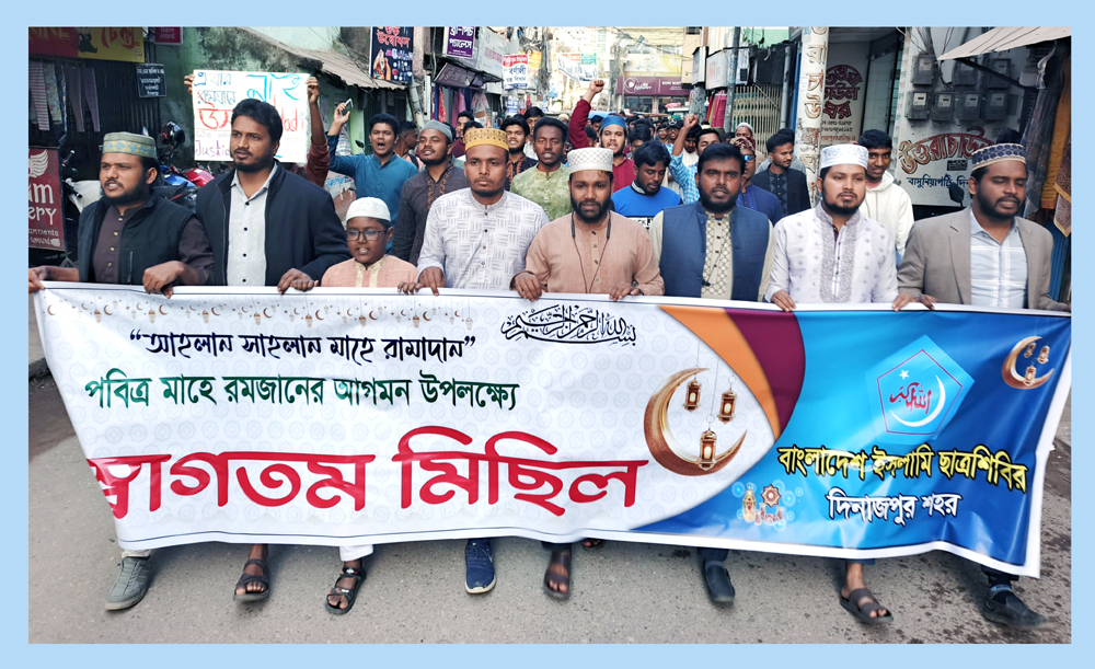 আসন্ন পবিত্র মাহে রমজানকে স্বাগত জানিয়ে এবং এর পবিত্রতা রক্ষার আহ্বানে দিনাজপুরে বর্ণাঢ্য র্যালী ও সমাবেশ করেছে বাংলাদেশ ইসলামী ছাত্রশিবির। বাংলাদেশ ইসলামী ছাত্রশিবির দিনাজপুর শহর শাখার উদ্যোগে এই কর্মসূচি পালিত হয়।