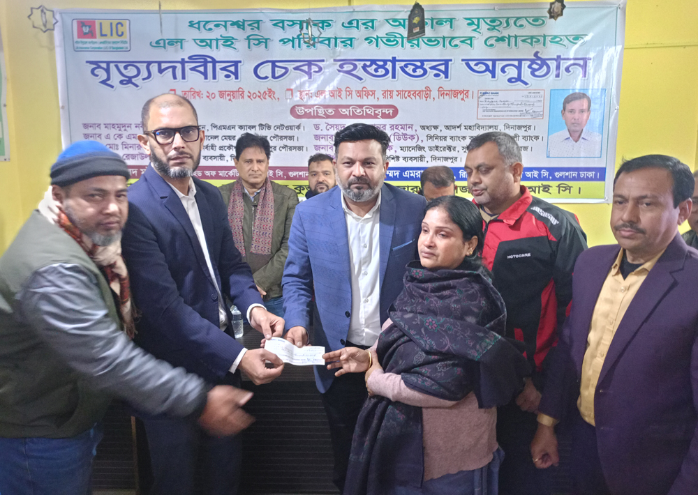 তার অকাল মৃত্যুতে এলআইসি দিনাজপুর অফিসের আয়োজনে আজ সোমবার সকাল সাড়ে ১১ টায় দিনাজপুর শাখার ব্রাঞ্চ ম্যানেজার বাচ্চু কুমার কুন্ডুর সভাপতিত্বে ধনেশ্বর বসাকের মৃত্যুদাবির চেক হস্তান্তর অনুষ্ঠান অনুষ্ঠিত হয়েছে।