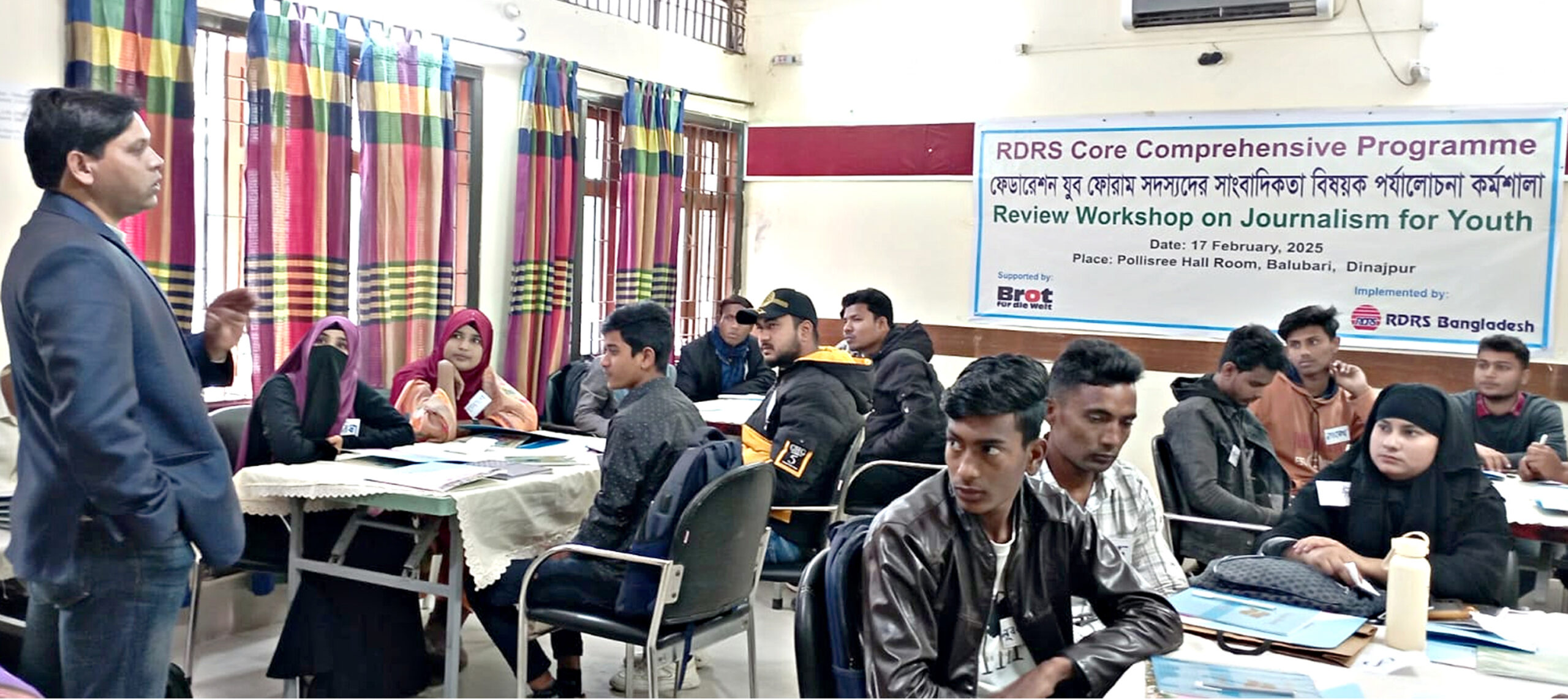 কর্মশালায় সভাপতিত্ব করেন আরডিআরএসের প্রজেক্ট কোঅর্ডিনেটর মতিউর রহমান। কর্মশালার উদ্বোধন করেন আরডিআরএস এর সিনিয়র কো-অর্ডিনেটর (সোস্যাল ডেভেলপমেন্ট) কেএম রাশেদুল আরফিন। কর্মশালায় বিভিন্ন বিষয়ে প্রশিক্ষক হিসেবে আলোচনায় অংশ নেন লেখক ও দৈনিক দেশবার্তার দিনাজপুর প্রতিনিধি আজহারুল আজাদ জুয়েল, দৈনিক উত্তরবঙ্গ পত্রিকার ভারপ্রাপ্ত সম্পাদক কাশী কুমার দাস, বাংলাদেশ টেলিভিশনের প্রতিনিধি মুফাচ্ছিরুল রাশেদ, প্রথম আলোর দিনাজপুর প্রতিনিধি রাজিউল ইসলাম রাজু। এ বিষয়ে আয়োজনকারী প্রতিষ্ঠান আরডিআরিএস বাংলাদেশ দিনাজপুর অঞ্চলের সিডিএস সুমিত্র কুমার সরকার বলেন, আরডিআরএস সারাদেশে যুবকদের আত্মিক উন্নয়ন, সমাজে যুবকদের ভূমিকা ও সামাজিক সাংস্কৃতিক কাজে অংশগ্রহণ বাড়াতে বিগত ৮ বছর ধরে কাজ করে যাচ্ছে। এ পর্যন্ত প্রায় ১০০টি কর্মশালার আয়োজন করা হয়েছে। যার মাধ্যমে যুবকরা সমাজের বিভিন্ন ক্ষেত্রে অবদান রেখে চলেছে। আরডিআরএস বাংলাদেশ নিজস্ব উদ্যোগে এ ধরনের কার্যক্রমের ধারাবাহিকতা অব্যাহত রাখছে। প্রশিক্ষকরা বলেন, সাংবাদিকতা প্রশিক্ষণ বা কর্মশালা একদিনের বিষয় নয়। যুব সমাজকে সাংবাদিকতার উপর ধারণা দেয়া এবং তাদেরকে এই পেশায় আসার জন্য উৎসাহিত করতে এই প্রশিক্ষণ কর্মশালা যথেষ্ট গুরুত্ব বহন করবে।