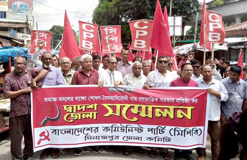 আজ শনিবার নাট্য সমিতি মিলনায়তনে বাংলাদেশের কিমিউনিস্ট পার্টি (সিপিবি) দিনাজপুর জেলা কমিটির আয়োজনে দ্বাদশ জেলা সম্মেলন এর প্রধান অতিথির বক্তব্যে তিনি উপরোক্ত কথাগুলো বলেন। সিপিবি দিনাজপুর জেলা কমিটির সভাপতি কমরেড এ্যাড. মেহেরুল ইসলাম এর সভাপতিত্বে সম্মানীত অতিথি হিসেবে বক্তব্য রাখেন কেন্দ্রীয় কমিটির সদস্য কমরেড আলতাফ হোসাইন। শুভেচ্ছা বক্তব্য রাখেন দিনাজপুর জেলা শাখার সাধারন সম্পাদক মো. ইকবাল হোসেন। এছাড়া আরও বক্তব্য রাখেন দিনাজপুর নাট্য সমিতির সাধারন সম্পাদক রেজাউর রহমান রেজু, কেন্দ্রীয় খেলাঘরের অন্যতম সদস্য নুরুল মতিন সৈকত, উদীচী জেলা সংসদের সভাপতি জলিল আহমেদ, সম্মিলিত সাংস্কৃতিক জোটের সভাপতি সুলতান কামাল উদ্দিন বাচ্চু, বাসদ নেতা সারোয়ার সাহান ক্লিপ্টন, এসএম নুরুজ্জামান, দয়া রাম রায়, গোলাম কিবরিয়া, দুলাল চক্রবর্তী, আফজাল হোসেন, দুর্জধন রায়, হাফিজার রহমান, টংক নাথ অধিকারী, আবুল কালাম আজাদ সহ জেলা ও উপজেলা হতে আগত সিপিবি’র নেতৃবৃন্দ। সঞ্চালকের দায়িত্ব পালন করেন জেলা কমিটির সদস্য অমৃত রায় ও প্রমথেশ শীল। আলোচনা সভার পূর্বে এক বর্ণাঢ্য বিক্ষোভ র‌্যালী শহরের প্রধান প্রধান সড়ক প্রদক্ষিন শেষে নাট্য সমিতিতে এসে সমাপ্ত হয়।