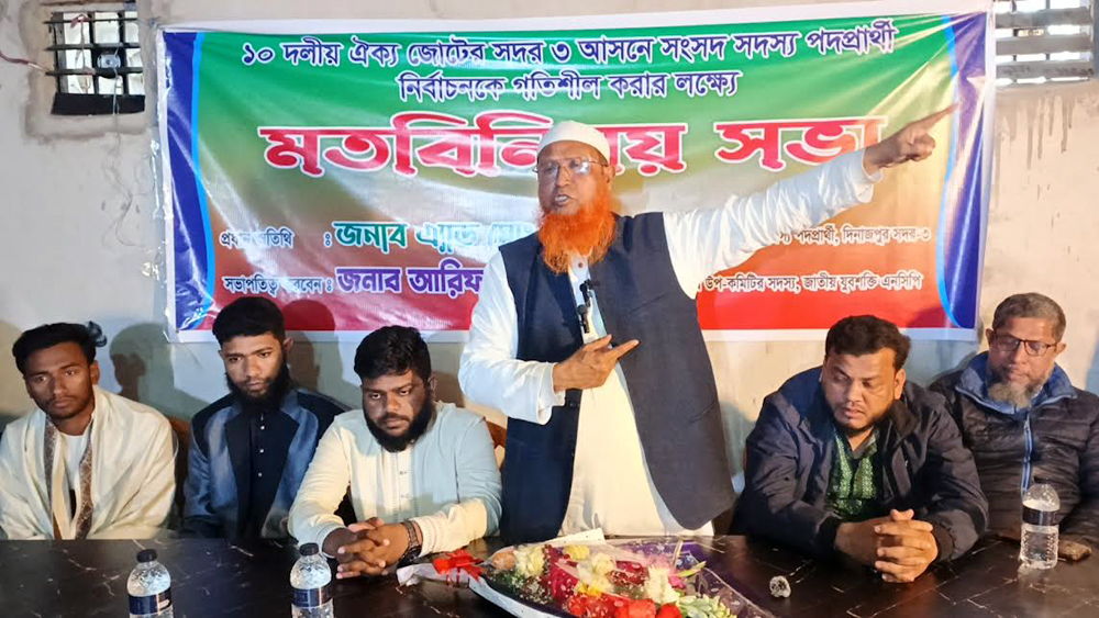 ​সভাপতির বক্তব্যে জাতীয় যুবশক্তির কেন্দ্রীয় সংগঠক আরিফ মুন নেতাকর্মীদের কঠোর পরিশ্রমের আহ্বান জানিয়ে বলেন, “আমরা দিনাজপুর-৩ সদর আসনটি ১০ দলীয় ঐক্যজোটকে উপহার দিতে চাই। আগামী ১২ ফেব্রুয়ারি নির্বাচনের দিন সকাল থেকে বিকেল পর্যন্ত ভোটারদের ভোটাধিকার প্রয়োগে সর্বোচ্চ সহযোগিতা করতে হবে এবং নির্বাচনী ফলাফল হাতে নিয়েই আমরা কেন্দ্র ত্যাগ করব।”