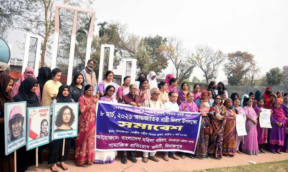 আজ রোববার সকাল সাড়ে ১০ টায় দিনাজপুরের ঐতিহ্যবাহী বড় ময়দানের কেন্দ্রীয় শহীদ মিনার প্রাঙ্গণে আন্তর্জাতিক নারী দিবস-২০২৬ উপলক্ষ্যে বাংলাদেশ মহিলা পরিষদ দিনাজপুর জেলা শাখা ও সামাজিক প্রতিরোধ কমিটি দিনাজপুর এর আয়োজনে অনুষ্ঠিত সমাবেশে সামাজিক অনাচার প্রতিরোধ কমিটির আহবায়ক মো. শফিকুল ইসলাম-এর সভাপতিত্বে এবং বাংলাদেশ মহিলা পরিষদ দিনাজপুর জেলা শাখার সাধারণ সম্পাদক রুবিনা আকতার এর সঞ্চালনায় সমাবেশের শুরুতেই লিখিত প্রবন্ধ উপস্থাপন করেন মহিলা পরিষদ জেলা শাখার সহ-সাধারণ সম্পাদক রুবি আফরোজ।