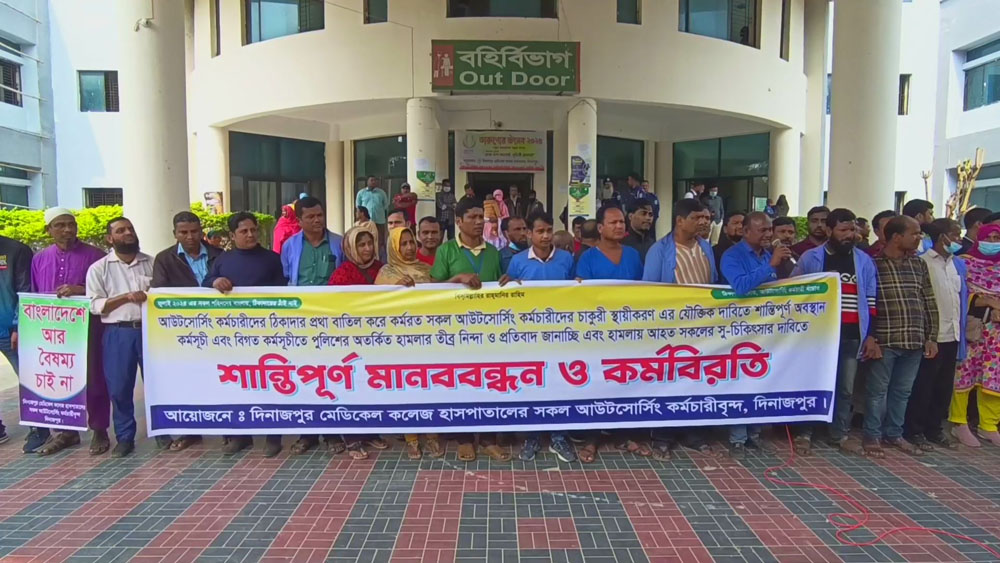 দিনাজপুর মেডিকেল কলেজ হাসপাতালের আউটসোর্সিং কর্মচারীদের কর্মবিরতি