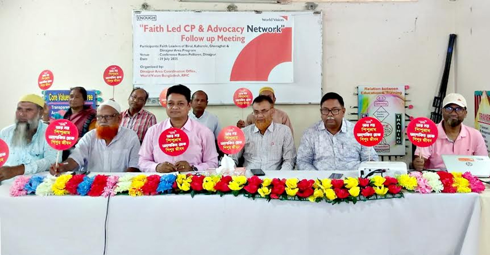 আজ মঙ্গলবার নেটওর্য়াকের জেলা সভাপতি কাজী আব্দুস ছাত্তার এর সভাপত্বিতে স্বাগত বক্তব্য রাখেন ওয়ার্ল্ড ভিশন এর এ্যাডভোকেসী কোঅর্ডিনেটর তানজিমুল ইসলাম। সম্মানিত অতিথি হিসেবে বক্তব্য রাখেন মহিলা বিষয়ক অধিদপ্তর দিনাজপুরের উপ-পরিচালক মোর্শেদ আলী খান, ইসলামিক ফাউন্ডেশন দিনাজপুর জেলা কার্যালয়ের উপ-পরিচালক মশিয়ুর রহমান। শুভেচ্ছা বক্তব্য রাখেন কাহারোল কমিটির সহ-সভাপতি আব্দুল কাদের, বিরল কমিটির সভাপতি রফিকুল ইসলাম, ঘোড়াঘাট কমিটির সভাপতি আলম চৌধুরী। ধর্মীয় নেতাদের পক্ষে বক্তব্য রাখেন হিন্দু ধর্মীয় প্রতিনিধি দ্বিজেন্দ্র রাথ রায়, দিপালী রাণী, কসবা মিশনের ফাদার বিদ্যা বর্মন। ওয়ার্ল্ড ভিশন এর এ্যাডভোকেসী কোঅর্ডিনেটর তানজিমুল ইসলাম বলেন, ওয়ার্ল্ড ভিশন শিশু সুরক্ষা ও শিশুদের নিয়ে যে স্বপ্ন দেখে এই প্লাটফর্ম এর প্রতিনিধিরা তা পূরণ করবেন। যে কয়েকটি মৌলিক চাহিদা রয়েছে তার মধ্যে ধর্ম একটি। আমরা মনে করি ধর্মীয় অনুশাসনের মাধ্যমে শিশু সুরক্ষা দিতে ধর্মীয় নেতারা যথেষ্ঠ অবদান রাখবেন। ওয়ার্ল্ড ভিশন ফাইভ জিরো প্লাস, এনাফ প্রচারাভিযানের মাধ্যমে শিশুদের ক্ষুধামুক্ত, অপুষ্টিমুক্ত শিশু, শিশু শ্রম বন্ধ, প্রতিটি শিশু স্কুলে যাবে, বাল্য বিবাহ নিরসন ও প্লাস্টিকমুক্ত পরিবেশবান্ধব জেলা গড়ে তুলতে ইতিবাচক পরিবর্তন আনতে হবে। তিনি আরও বলেন, এই প্লাটফর্মের অর্জন হয়েছে অতি দরিদ্র শিশুদের আর্থিক সহায়তা ৫৮৯ জনকে, বাড়ি বাড়ি দিয়ে শিশু জরিপ করা হয়েছে ১৪৭৭ জন, শিশু সুরক্ষা ও বাল্য বিবাহ বন্ধ করা হয়েছে ২৩৩ জনসহ বিভিন্ন অর্জন তুলে ধরেন। এছাড়া জিংক ফুড ও গুনগত শিক্ষার মান বিষয়ক উপস্থিত প্রতিনিধিরা আলোচনা করেন। প্রজেক্টরের মাধ্যমে বিভিন্ন তথ্য তুলে ধরে বক্তব্য রাখেন ওয়ার্ল্ড ভিশন দিনাজপুরের পিকিউ অফিসার মো. মবিন উদ্দিন। শুভেচ্ছা বক্তব্য রাখেন ওয়ার্ল্ড ভিশনের বিরল এরিয়া প্রোগ্রাম অফিসার মো. গোলাম সাকলায়েন। সঞ্চালকের দায়িত্ব পালন করেন দিনাজপুর ওয়ার্ল্ড ভিশন অফিসের প্রোগ্রাম অফিসার ভিক্টরিয়া বিশ্বাস ও ফেসিলেটর শামীম শাহরিয়ার।