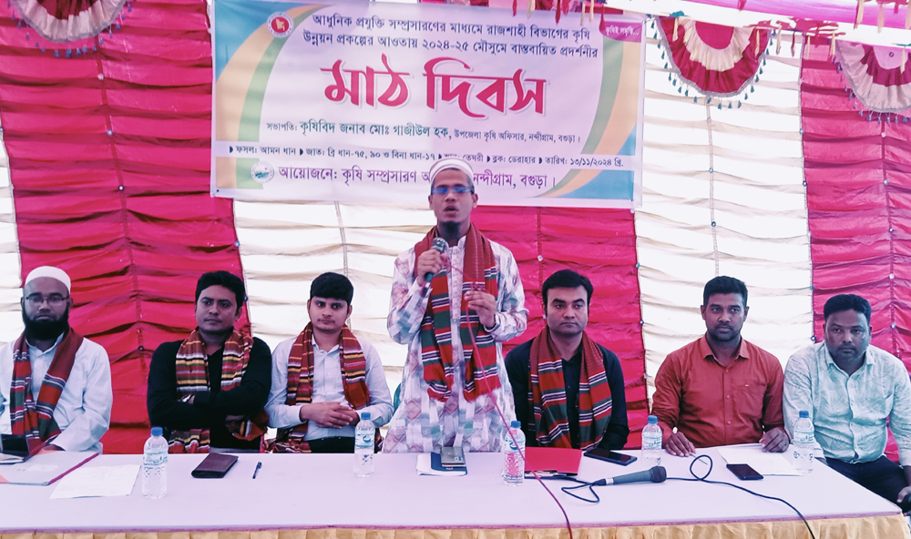 কৃষিই সমৃদ্ধি-এই প্রতিপাদ্যে বগুড়ার নন্দীগ্রামে আজ বুধবার বিকেল সাড়ে ৩টায় নন্দীগ্রাম উপজেলা কৃষি সম্প্রসারণ অধিদপ্তরের আয়োজনে ২নং নন্দীগ্রাম (সদর) ইউনিয়নের তেঘরী মাঠে আধুনিক প্রযুক্তি সম্প্রসাণের মাধ্যমে রাজশাহী বিভাগের কৃষি উন্নয়ন প্রকল্পের আওতায় ২০২৪-২৫ মৌসুমে বাস্তবায়িত প্রদর্শনীর কৃষক মাঠ দিবস অনুষ্ঠিত হয়েছে।