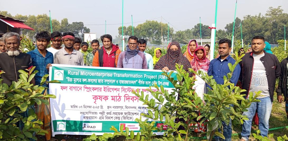 দিনাজপুরের নবাবগঞ্জ উপজেলার বিনোদনগর ইউনিয়নের নারায়ণপুর গ্রামে RMTP প্রকল্পের আওতায় “উচ্চমূল্যের ফল–ফসলের জাত সম্প্রসারণ ও বাজারজাতকরণ” ভ্যালু চেইন উপ-প্রকল্পের ফল বাগানে স্প্রিংকলার ইরিগেশন সিস্টেমের ফলাফলের ওপর কৃষক মাঠ দিবস’ অনুষ্ঠিত হয়েছে।