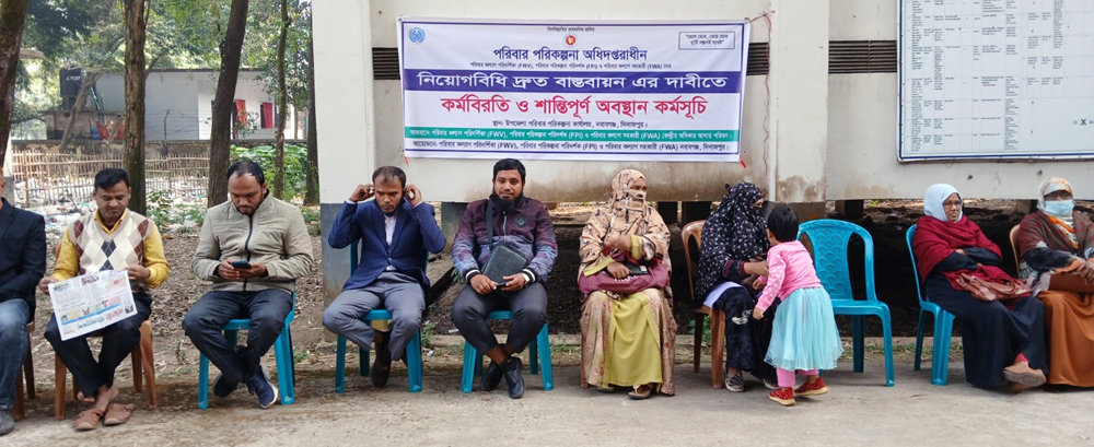 দিনাজপুরের নবাবগঞ্জে নিয়োগ বিধিমালা বাস্তবায়নের দাবিতে পরিবার কল্যাণ বিভাগের পরিবার কল্যাণ পরিদর্শিকা, পরিবার পরিকল্পনা পরিদর্শক ও পরিবার কল্যাণ সহকারীরা কর্মবিরতি ও শান্তিপূর্ণ অবস্থান কর্মসূচি পালন করেছেন।