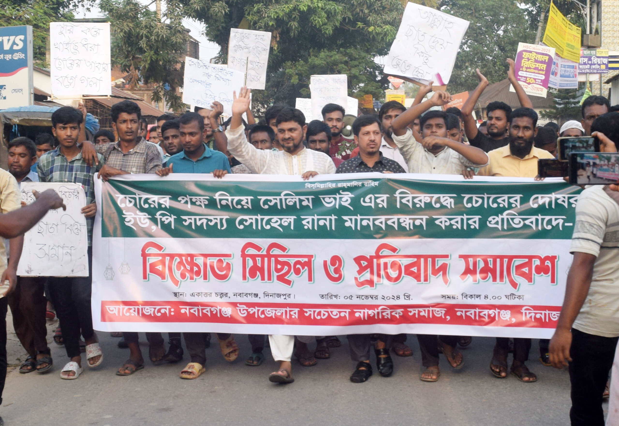 দিনাজপুরের নবাবগঞ্জে চোরের পক্ষ নিয়ে ২নং বিনোদনগর ইউনিয়নের ২নং ওয়ার্ডের সদস্য সোহেল রানার ইন্ধনে করা মানববন্ধনের প্রতিবাদে বিক্ষোভ মিছিল ও প্রতিবাদ সমাবেশ করেছে নবাবগঞ্জ সচেতন নাগরিক সমাজ ।