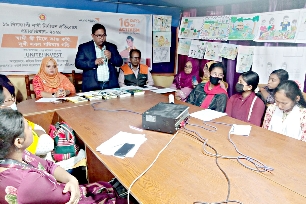ওয়ার্ল্ড ভিশন বাংলাদেশ দিনাজপুর এপি’র সিনিয়র ম্যানেজার অরবিন্দ সিলভেস্টার গমেজ এর সভাপতিত্বে প্রধান অতিথি হিসেবে বক্তব্য রাখেন মহিলা বিষয়ক অধিদপ্তরের উপ-পরিচাক মোর্শেদ আলী খান। শুভেচ্ছা বক্তব্য রাখেন দিনাজপুর সদর উপজেলার তথ্য সেবা কর্মকর্তা মোছা. উম্মে কুলসুম, উপজেলা স্বাস্থ্য কমপ্লেক্সের ইনচার্জ স্বাস্থ্য পরিদর্শক বিশ্বনাথ বসাক, দুর্বার নেটওয়ার্ক নারী পক্ষর সদস্য ও বহ্নিশিখা মহিলা উন্নয়ন সংস্থার সাধারন সম্পাদক খ্রীষ্টিনা লাভলী দাশ, ব্রাকের আরএমজিজেডি’র রিজিওনাল ম্যানেজার মো. জাহিদুর রহমান, দীপ্তি ফাউন্ডেশন হাউজ অফ হোপ এর প্রকল্প ব্যবস্থাপক হান্না রায়, উদ্যোগ সংস্থার সহকারী প্রোগ্রাম অফিসার মোছা. বিলকিস বেগম, পল্লীশ্রী’র প্রোগ্রাম অফিসার শাহাজাদী শিরিন, ওয়ান স্টপ ক্রাইসিস সেল এর প্রোগ্রাম অফিসার মোছা. সাবিহা বিনতে আনোয়ার। বক্তারা বলেন, নারী ও শিশুর উপর সকল প্রকার হয়রানী. নির্যাতন ও সহিংসতা প্রতিরোধ এবং প্রতিকারে সরকার ও প্রশাসনের কার্যকর পদক্ষেপ নিতে হবে। নারীর সার্বিক সুরস্থা নিশ্চিত করতে রাষ্ট্রীয় উদ্যোগ ও পুলিশি নিরাপত্তার পাশাপাশি সামাজিক নিরাপত্তার দিকেও আমাদের দৃষ্টি দিতে হবে। তাই আসুন আমরা সকলে মিলে নারী ও শিশুর উপর সকল প্রকার সহিংসতার বিরুদ্ধে ঐক্যবদ্ধভাবে প্রতিবাদ করি। সভাপতির বক্তব্যে অরবিন্দ সিলভেস্টর গমেজ বলেন, ন্যায় বিচার ও সমঅধিকার প্রতিষ্ঠা করতে পারলে নারী ও শিশুর উপর সকল প্রকার সহিংসতা প্রতিরোধ করা সম্ভব হবে। এব্যাপারে নারীর ক্ষমতায়ন বৃদ্ধি পাবে। আর এই কাজটি আমরা আমাদের পরিবার থেকে শুরু করতে চাই। শেষে ১৬ দিনব্যাপী নারী নির্যাতন প্রতিরোধ প্রচারাভিযান উপলক্ষ্যে চিত্রাংকন প্রতিযোগিতায় শ্রেষ্ঠ ১০ জন শিশুকে পুরস্কার প্রদান করা হয়। সার্বিক তত্ত্বাবধানে ছিলেন প্রোগ্রাম অফিসার সারামিতা হালদার ও ইষ্টেলা সরেন।