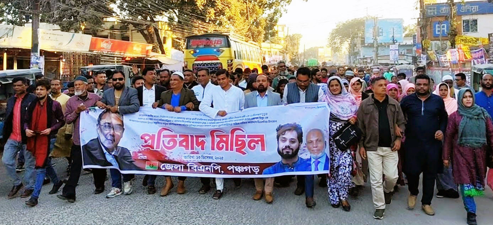 আজ শনিবার বিকেলে পঞ্চগড় জেলা বিএনপি কার্য্যালয় থেকে জেলা বিএনপি’র সদস্য সচিব ফরাহাদ হোসেন আজাদের নেতৃত্বে বিক্ষোভ মিছিল বের করে নেতাকর্মীরা। এ সময় সাবেক মহিলা সংসদ সদস্য এডভোকেট রিনা পারভিন জেলা বিএনপি’র যুগ্ম আহবায়ক মির্জা নাজমুল ইসলাম কাজল,জেলা বিএনপির সাবেক সাংগঠনিক সম্পাদক সফিউজ্জামান পাটোয়ারি রূবেল, জেলা যুবদলের সভাপতি ফেরদৌস ওয়াহিদ রাসেল, সাধারন সম্পাদক নুরুজ্জামান বাবু পৌর বিএনপি নেতা আব্দুল্লাহ আল মামুন রনিক সহ সেচ্ছাসেবক দল, ছাত্রদল,মহিলা দল,শ্রমিক দল সহ বিএনপি’র অঙ্গ ও সহযোগী সংগঠনের নেতাকর্মীরা উপস্থিত ছিল । মিছিলটি জেলা শহরের বিভিন্ন সড়ক প্রদক্ষিন শেষে আবারও দলীয় কার্য্যালয়ে শেষ হয়। পরে সেখানেই প্রতিবাদ সমাবেশ করা হয়। প্রতিবাদ সমাবেশে বিএনপি’র পল্লী উন্নয়ক বিষয়ক সম্পাদক ফরহাদ হোসেন আজাদ সহ বিএনপি ছাত্রদল যুবদলের সভাপতি সাধারন সম্পাদকগণ বক্তব্য রাখেন। বক্তারা জানান আগামি জাতীয় সংসদ নির্বাচনকে বাধাগ্রস্থ করতে উদ্দেশ্যপ্রনোদীতভাবে উসমান হাদি এবং এরশাদউল্লাহকে গুলিবিদ্ধ করা হয়েছে। অতি দ্রুত এই ঘটনায় জড়িতদের বের করে শাস্তির আওতায় আনতে অন্তর্বতি সরকারের প্রতি আহবান জানান।
