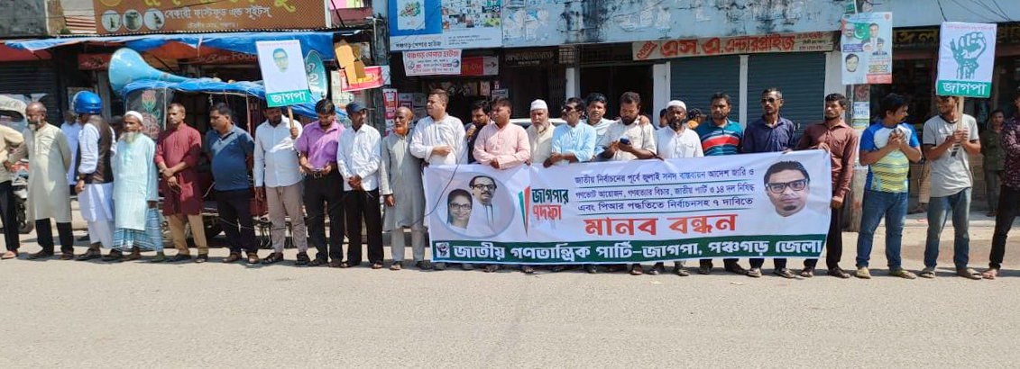 কেন্দ্র ঘোষিত কর্মসূচির অংশ হিসেবে জাতীয় নির্বাচনের পূর্বে জুলাই সনদ বাস্তবায়ন, আদেশ জারি ও গণভোট আয়োজন, গণহত্যার বিচার, জাতীয় পার্টি ও ১৪ দল নিষিদ্ধ এবং পিআর পদ্ধতিতে নির্বাচনসহ ৭ দফা দাবিতে পঞ্চগড় জেলা জাতীয় গণতান্ত্রিক পার্টি’ র (জাগপা’র) মানব বন্ধন অনুষ্ঠিত হয়েছে।