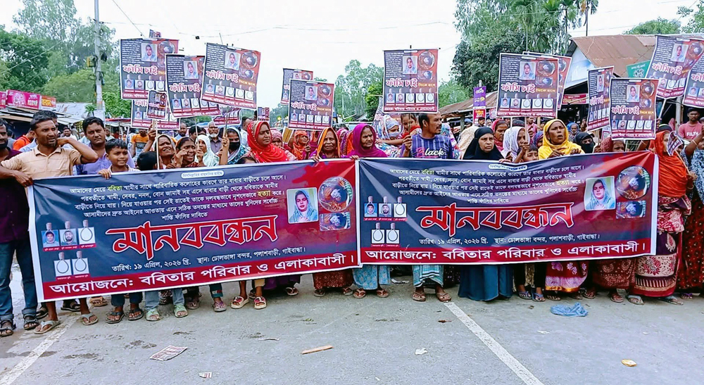 গাইবান্ধা জেলার পলাশবাড়ী উপজেলার ঢোলভাঙ্গা বাজার এলাকার গৃহবধু ববিতা হত্যাকারীদের গ্রেফতার ও ফাঁসির দাবিতে এক মানববন্ধন ও গাইবান্ধা পলাশবাড়ী মহাসড়ক অবরোধ করে বিক্ষোভ করেছে এলাকাবাসী।