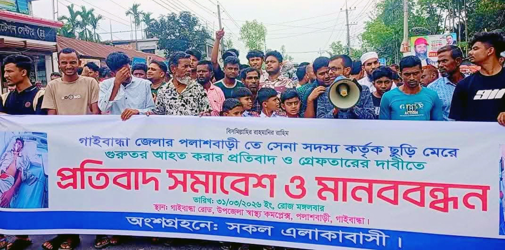 গাইবান্ধার পলাশবাড়ীতে এস এস সি পরীক্ষার্থীকে ছুরিকাঘাত করে আহত করা অভিযুক্ত আমিনুল ইসলাম বাবুকে গ্রেফতারের দাবিতে মানববন্ধন প্রতিবাদ সমাবেশ অনুষ্ঠিত হয়েছে।