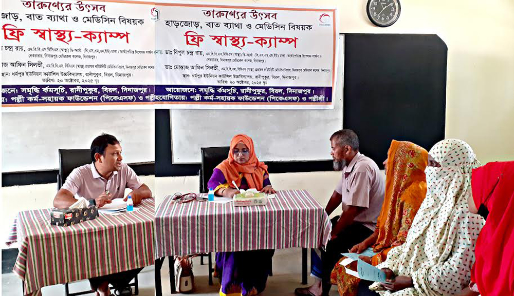 পল্লী কর্ম সহায়ক ফাউন্ডেশন (পিকেএসএফ) ও বেসরকারি উন্নয়ন সংস্থা পল্লীশ্রী এর অর্থায়নে সমৃদ্ধি কর্মসূচির আয়োজনে বিরল উপজেলার রানীপুকুর ইউনিয়নে ধর্মপুর ইউনিয়ন কাউন্সিল উচ্চ বিদ্যালয় মাঠ প্রাঙ্গনে ফ্রি সাধারণ স্বাস্থ্য ক্যাম্প অনুষ্ঠিত হয়।