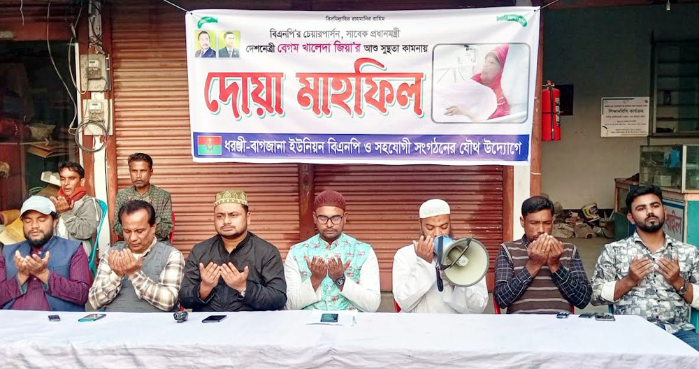 জয়পুরহাটের পাঁচবিবি উপজেলার সীমান্তবর্তী বাগজানা ইউনিয়নে বাংলাদেশের ৩ বারের সফল প্রধানমন্ত্রী গনতন্ত্রের মা ও বিএনপি’র চেয়ারপার্সন বেগম খালেদা জিয়ার সুস্থতা কামনায় দোয়া মাহফিল অনুষ্ঠিত হয়েছে ।