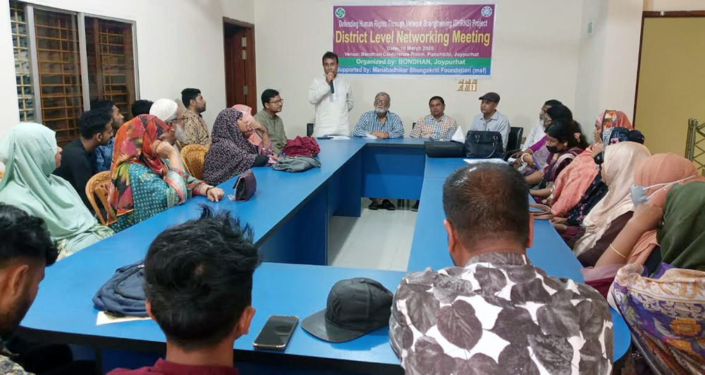 আজ মঙ্গলবার বেলা ১১টায় জয়পুরহাট জেলার পাঁচবিবি উপজেলার বন্ধন মিলনায়তনে ‘ডিফেন্ডিং হিউম্যান রাইটস থ্রু নেটওয়ার্ক স্ট্রেংথেনিং (ডিএইচআরএনএস) প্রকল্পের আওতায় এ সভার আয়োজন করে বন্ধন, সহযোগিতায় ছিল মানবাধিকার সংস্কৃতি ফাউন্ডেশন (এমএসএফ)।