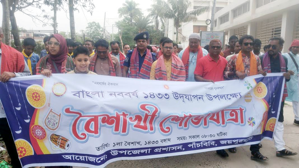 সকাল সাড়ে ৯ টায় উপজেলা প্রশাসনের আয়োজনে পাঁচবিবি উপজেলা চত্ত্বর থেকে বিভিন্ন সাজে সজ্জিত হয়ে উপজেলা নির্বাহী কর্মকর্তা মোঃ সেলিম আহমেদের নেতৃত্বে উপজেলা বিভিন্ন দপ্তরের কর্মকর্তা, কর্মচারী, রাজনৈতিক দল, সামাজিক সংগঠন, শিক্ষা প্রতিষ্ঠানের সমন্বয়ে একটি বৈশাখী শোভাযাত্রা বের হয়। পরে শহরের কয়েকটি প্রধান সড়ক প্রদিক্ষণ করে উপজেলা চত্তরে এসে শেষ হয়।