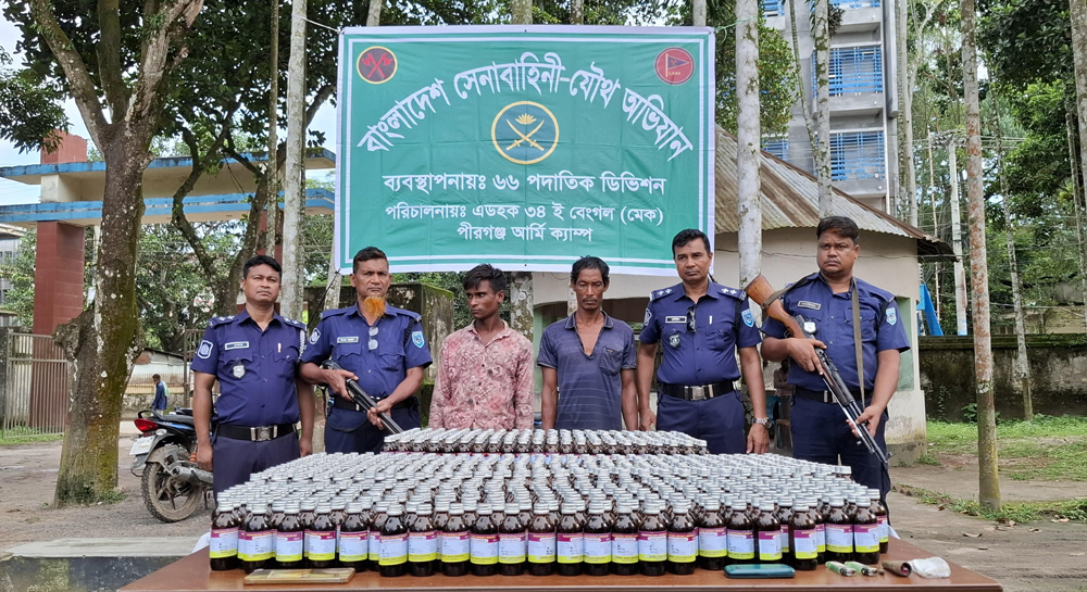 যৌথবাহিনী সূত্রে জানা গেছে, আজ বৃহস্পতিবার দুপুরে বাংলাদেশ সেনাবাহিনীর ৬৬ পদাতিক ডিভিশনের ৭২ পদাতিক ব্রিগ্রেড এর ৩৪ ইষ্ট বেঙ্গল (মেক:) পীরগঞ্জ আর্মি ক্যাম্পের কমান্ডার ক্যাপ্টেন রাকিবুল ইসলামের নেতৃত্বে ১৬ সদস্যের যৌথবাহিনী গোপন সংবাদের ভিত্তিতে ১টি মিশুক গাড়ি আটকিয়ে তল্লাশী চালায়। এ সময় ৫ টি কার্টুনে এ্যালকোহল জাতীয় রিয়েক্টিফাইড স্পিরিটের ১ হাজার ৭৯ বোতল উদ্ধারসহ দুজনকে আটক করে। আটককৃতরা হলো পীরগঞ্জ উপজেলার শানেরহাট ইউনিয়নের হরিরাম সাহাপুর গ্রামের বসন্ত চন্দ্রের ছেলে শ্রী সুকান্ত চন্দ্র বর্মন (৩৪) ও একই গ্রামের রাবু হোসেনের ছেলে রাকিব হোসেন (২২)। পরে আটককৃতদের পীরগঞ্জ থানায় হস্তান্তর করেন যৌথবাহিনী।