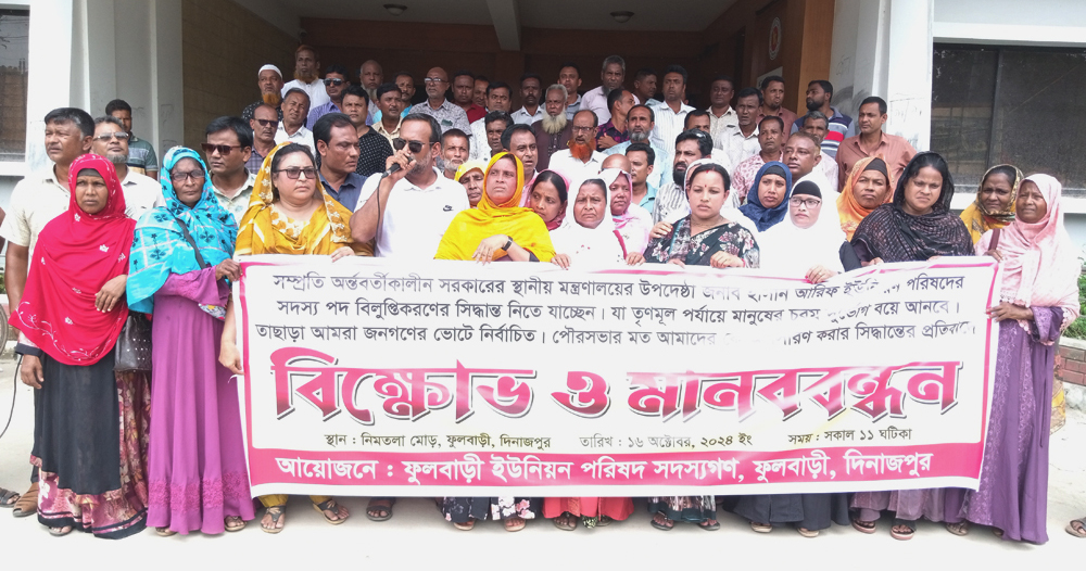 দিনাজপুরের ফুলবাড়ীতে ৭টি ইউনিয়ন পরিষদের সদস্য ও সংরক্ষিত মহিলা সদস্যদের অপসারণ অপসারণ সিদ্ধান্তের প্রতিবাদে মানববন্ধন, বিক্ষোভসহ প্রধান উপদেষ্টা বরাবর স্মারকলিপি প্রদান করা হয়েছে। বুধবার বেলা ১১টায় ফুলবাড়ী পৌর শহরের নীমতলা মোড়ে উপজেলার ৭টি ইউনিয়নের সদস্য ও সংরক্ষিত মহিলা সদস্যরা ঘন্টাব্যাপী এই মানববন্ধন করেন। খয়েরবাড়ী ইউনিয়ন পরিষদের সদস্য শামীম হোসেনের সঞ্চালনায় মানববন্ধনে বক্তব্য রাখেন ইউপি সদস্য ফয়জার রহমান, সিরাজুল ইসলাম, গউর উদ্দিন, তসলিম, কাঞ্চন , মান্নান, কামাল, নুরুল ইসলাম নুরু, লিটন, সনি, রমিউল ইসলাম, দিলিপ কুমার রায় প্রমুখ।