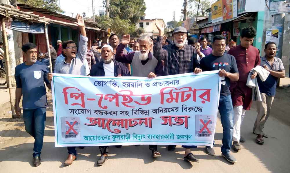 দিনাজপুরের ফুলবাড়ীতে নর্দান ইলেকট্রিসিটি সাপ্লাই পিএলসি (নেসকো) কর্তৃক বিদ্যুতের প্রিপেইড মিটার স্থাপন না করার দাবী এবং গ্রাহক হয়রানী ও অনিয়মের প্রতিবাদসহ প্রিপেইড মিটারের প্রকল্প বাতিলের দাবিতে বিক্ষোভ মিছিল ও প্রতিবাদ সভা করেছেন স্থানীয় গ্রাহকরা।