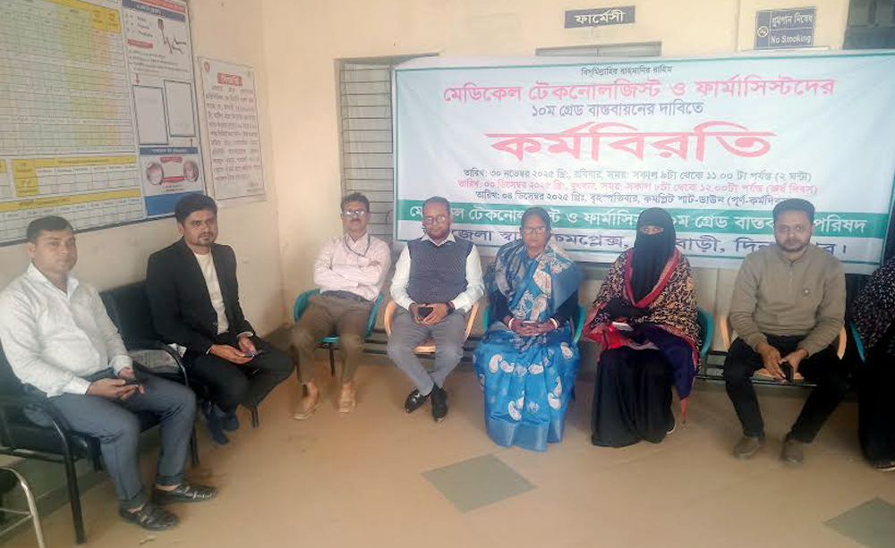 ১১শ থেকে ১০ম গ্রেড বাস্তবায়নের দাবিতে কেন্দ্রীয় কর্মসূচীর অংশ হিসেবে মেডিকেল টেকনোলজিস্ট ও ফার্মাসিস্টদের অর্ধদিবস কর্মবিরতি পালিত হয়েছে। গতকাল বুধবার সকাল ৮টা থেকে দুপুর ১২টা পর্যন্ত দিনাজপুরের ফুলবাড়ী উপজেলা স্বাস্থ্য কমপ্লেক্সে চত্ত্বরে কর্মবিরতি পালন করেন বৈষম্যের শিকার মেডিকেল টেকনোলজিস্ট ও ফার্মাসিস্টরা। এসময় দূর-দূরান্ত থেকে চিকিৎসাসেবা নিতে আসা রোগীরা পড়েন ভোগান্তিতে।