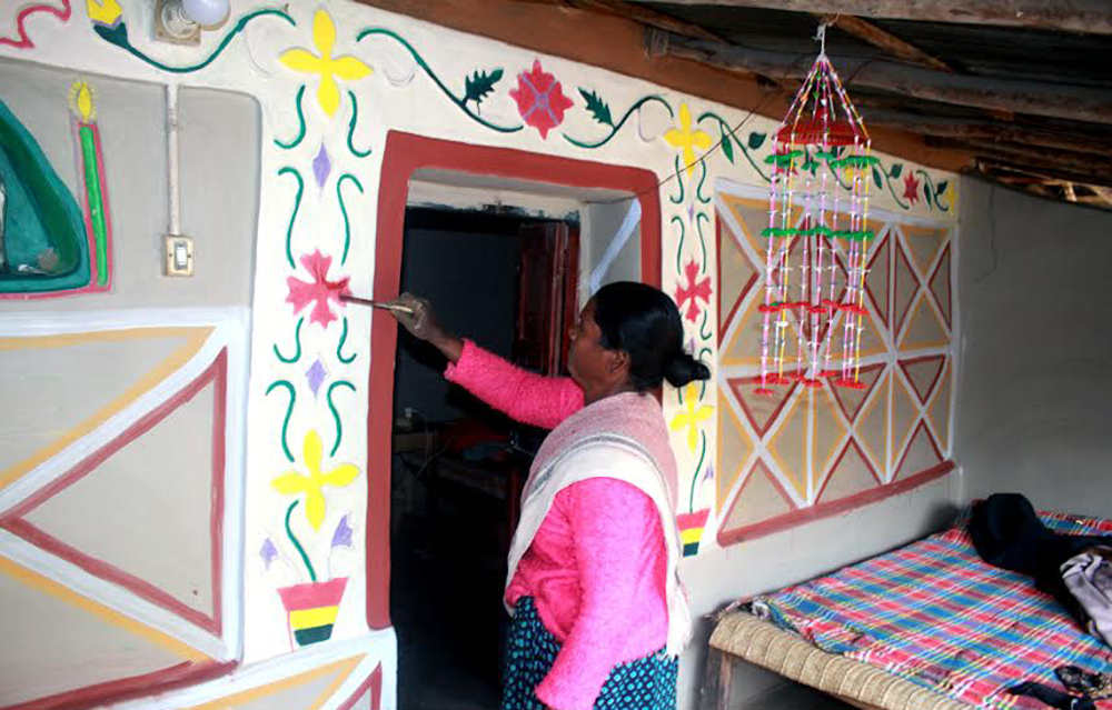 আলপনা আঁকতে আঁকতে লুচিয়া কিসকু বলছিলেন, ‘সরই হেতু ওড়া সাজাও। সিকাতে রংইং ক্রিংয়া পাইসা বানু তিয়া।’ (বড়দিন উপলক্ষে বাড়ি সাজাচ্ছি। চুন দিয়ে এভাবে রং বা আলপনা আঁকছি। টাকা নেই কী আর করা)।একই কথাবলেন ইতি কিনা মার্ডি।