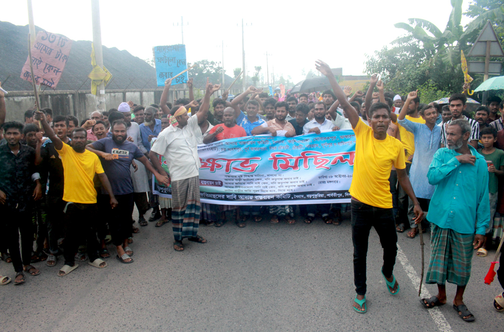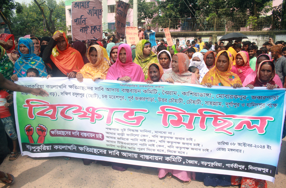 দিনাজপুরের বড়পুকুরিয়া কয়লা খনি এলকায় ক্ষতি পুরণসহ ৬দফা দাবিতে বিক্ষোভ মিছিল ও অবস্থান কর্মসুচি পালন করেছেন ক্ষতিগ্রস্থ গ্রামবাসীরা। আজ (মঙ্গলবার) সকাল ১০টায় বড়পুকুরিয়া কয়লা খনি এলাকার ক্ষতিগ্রস্থদের দাবি আদায় বাস্তবায়ন কমিটির ব্যানারে বিভিন্ন দাবী সংবলিত ব্যানার ফেষ্টুন হাতে খনির মুল ফটকের সামনে দাঁড়িয়ে দুই ঘন্টা ব্যাপী অবস্থান কর্মসুচি পালন করা হয়। এর আগে ক্ষতিগ্রস্থ ১৩টি গ্রামের প্রায় ২ হাজার বিভিন্ন বয়সী নারী-পুরুষ দলে দলে বিক্ষোভ মিছিল নিয়ে খনি গেটের সামনে সমবেত হন।