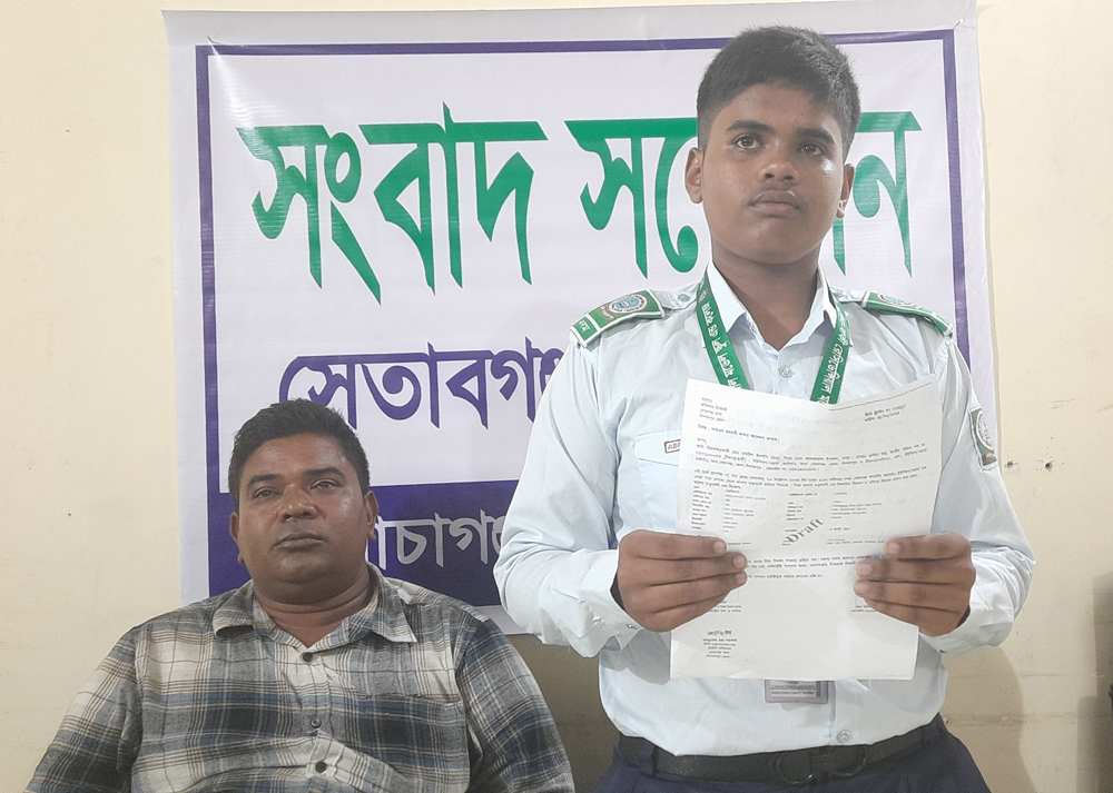 গত ১২ নভেম্বর মঙ্গল রাতে সেতাবগঞ্জ প্রেসক্লাবে সংবাদ সম্মেলনে লিখিত বক্তব্যে জানান, বিদ্যালয়ের ব্যবস্থাপনা কমিটি ও অধ্যক্ষ আমাকে অন্যায় ভাবে বহিষ্কার করেছে। আমি এর বিচার চাই। ইস্তিকার আরো বলেন, প্রতিষ্ঠানের প্রশাসনিক কর্মকর্তা আব্দুর রহমান এর স্বেচ্ছাচারিতার ব্যাপারে ইতিপূর্বে প্রতিষ্ঠানের অধ্যক্ষ লে. কর্ণেল (অব.) কাজী সাহাবুদ্দীন বরাবরে আবেদন করার পরও তিনি আব্দুর রহমান এর বিরুদ্ধে কোন ব্যবস্থা গ্রহন না করায় ৩১ অক্টোবর রাতে প্রতিষ্ঠানের ৫-৬শ আবাসিক শিক্ষার্থী আন্দোলন করে। সে সময় শিক্ষার্থীদের দাবির মুখে আব্দুর রহমান স্কুল থেকে চলে যান। ঐদিন অধ্যক্ষ শিক্ষার্থীদের সকল দাবি মেনে নিয়ে ১ নভেম্বর থেকে স্কুল ছুটি ঘোষণা করেন। ১ নভেম্বর শিক্ষার্থীরা নিজ বাসায় চলে যায়। পরবর্তীতে আমার অভিভাবকসহ আমাকে স্কুলে ডেকে বলা হয় কিসের জন্য আন্দোলন করেছি। আমরা আন্দোলনের বিষয় তুলে ধরি। সেদিন আমাদের কিছু না জানানো হলেও ১২ নভেম্বর রাতে প্রতিষ্ঠানের পক্ষ থেকে আমার বাবা কামরুল হাসানকে ফোন করে বলা হয় আপনার সন্তানকে আর স্কুলে পাঠানোর প্রয়োজন নেই। তাকে বহিষ্কার করা হয়েছে। আপনি কালকে এসে আপনার সন্তানের ছাড়পত্র নিয়ে যাবেন। ইস্তিকার অভিযোগ করে বলেন, সেদিন ৫-৬শ শিক্ষার্থী আন্দোলনে অংশ নিয়েছিল অথচ ৪০-৫০ জনকে উদ্দেশ্য প্রণোদিত ভাবে টিসি প্রদান করা হয়। আগামী ২০ দিন পর আমার ফাইনাল পরীক্ষা এ অবস্থায় আমাকে বহিষ্কার করা হল। আমার ভবিষ্যত কি হবে? আমি এর বিচার চাই। এ বিষয়ে ইস্তিকারের বাবা কামরুল হাসান বলেন, ফাইনাল পরীক্ষার মাত্র ২০ দিন আগে আমার সন্তান সহ ৪০/৫০ জন শিক্ষার্থীকে অন্যায় ভাবে বহিষ্কার করা হয়েছে। আমি এখন এই সন্তানকে নিয়ে কোথায় যাবো। সেতাবগঞ্জ প্রেসক্লাবের মাধ্যমে আমি এর বিচার চাই।