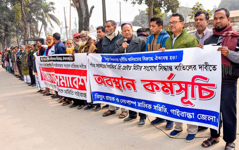 প্রিপেইড মিটার সংযোগের বিরুদ্ধে আজ রোববার সকাল ১১ টায় গাইবান্ধা জেলা প্রশাসকের কার্যালয়ের সামনে অবস্থান কর্মসূচি পালন করা হয়। গাইবান্ধা বিদ্যুৎ গ্রাহক ও সেচপাম্প মালিক সমিতি এই কর্মসূচির আয়োজন করে। শেষে জেলা প্রশাসককে স্মারকলিপি দেওয়া হয়।