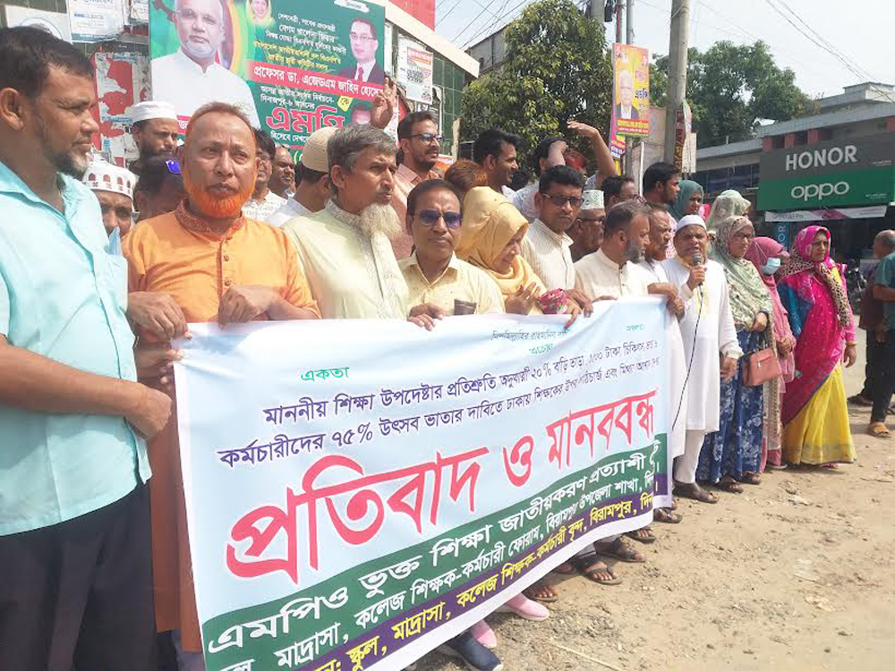 বিরামপুর উপজেলার বে-সরকারী শিক্ষকবৃন্দ বাড়ি ভাড়া, চিকিৎসা ভাতা ও উৎসব ভাতা বৃদ্ধির দাবি এবং ঢাকায় আন্দোলনরত শিক্ষকদের উপর লাঠিচার্জের প্রতিবাদে আজ বুধবার বিক্ষোভ মিছিল, মানববন্ধন ও প্রতিবাদ সভা করেছেন।