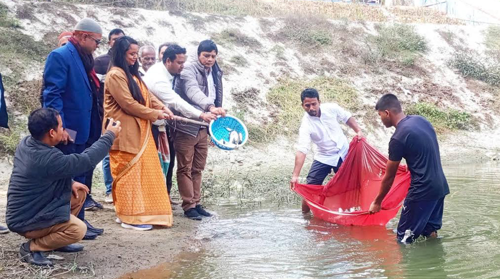 বীরগঞ্জে উৎপাদন বৃদ্ধির লক্ষ্যে পোনা মাছ অবমুক্তকরণ