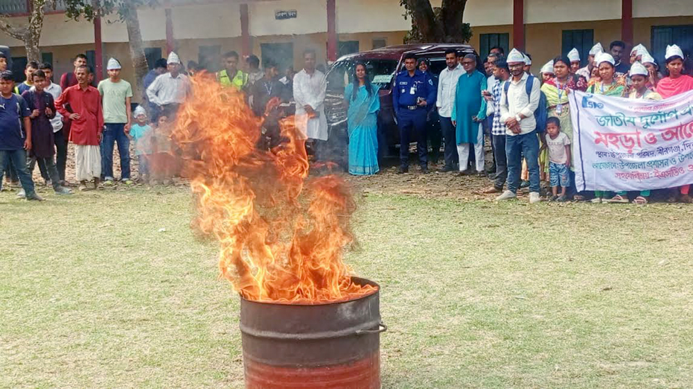 পরে ফায়ার সার্ভিস ও সিভিল ডিফেন্সের সদস্যরা দুর্যোগ মোকাবেলা ও অগ্নিনির্বাপণ বিষয়ে একটি বাস্তবধর্মী মহড়া প্রদর্শন করেন। ভারপ্রাপ্ত স্টেশন অফিসার মোসলেম উদ্দিন মহড়ার বিভিন্ন ধাপ সম্পর্কে অংশগ্রহণকারীদের দিকনির্দেশনা দেন। তিনি আগুন লাগলে দ্রুত কীভাবে প্রতিক্রিয়া জানাতে হবে এবং ঘরে বসেই প্রাথমিকভাবে কীভাবে আগুন নিয়ন্ত্রণে আনা যায় সে বিষয়ে বাস্তব প্রদর্শনের মাধ্যমে উপস্থিত সবাইকে অবহিত করেন।