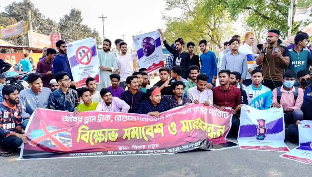 দিনাজপুরের বীরগঞ্জে পৌরশহরের বিজয় চত্ত্বরে বীরগঞ্জের সর্বস্তরের ছাত্র-জনতার আয়োজনে ড্রাম ট্রাক, অনুমোদন বিহীন যানবাহন বন্ধের দাবিতে ঘন্টা ব্যাপী সড়ক অবরোধ করে বিক্ষোভ সমাবেশ ও মানববন্ধন অনুষ্ঠিত হয়েছে।