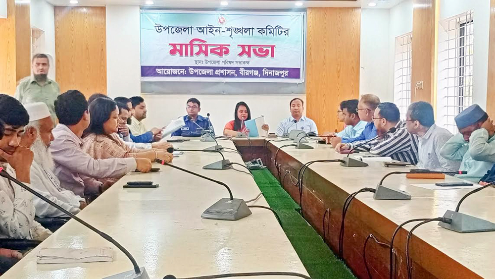 সভায় উপজেলার সার্বিক আইন-শৃঙ্খলা পরিস্থিতি, অপরাধ দমন, মাদক নিয়ন্ত্রণ, যানজট নিরসনসহ বিভিন্ন গুরুত্বপূর্ণ বিষয় নিয়ে আলোচনা করা হয়। এ সময় সহকারী কমিশনার (ভূমি) ও পৌর প্রশাসন দীপংকর বর্মন, বীরগঞ্জ থানার অফিসার ইনচার্জ মো. সাইফুল ইসলামসহ প্রশাসনের বিভিন্ন দপ্তরের কর্মকর্তা, ইউনিয়ন চেয়ারম্যানগন, আইন-শৃঙ্খলা কমিটির সদস্যরা উপস্থিত ছিলেন।